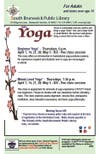 Beginner Yoga is on Thursdays at 6 p.m. ; Mixed Level follows at 7:30 p.m. (5 classes) - April 7, 14, 21, 28; May 5. Cost $55. Session 2 (4 classes) - May 12, 19, 26; June 2. Cost $44. Suitable for anyone age 14 and up. Registration and fee required at the time of registration at the Information Desk in the Library. No cash accepted. Make check or money order payable to The Friends of the South Brunswick Library. Dress in comfortable exercise clothes. Bring a large towel and a yoga "sticky" mat with you to class. The room is often cool so please bring a sweat shirt.