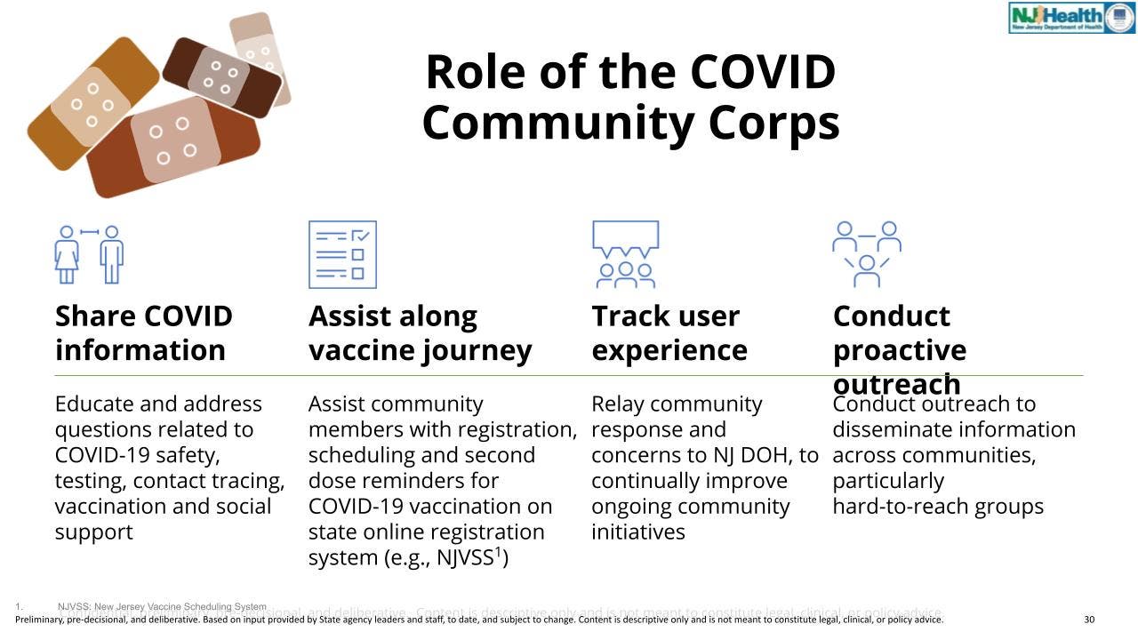 The COVID Community Corps (CCC) trains trusted community members to educate and deliver COVID-19 vaccination information and navigation support to underserved communities in the State of New Jersey.