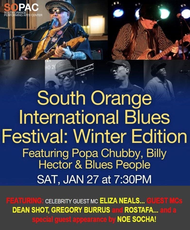 Sat Jan 27 South Orange International Blues Festival: Winter Edition at SOPAC - South Orange Perfuming Arts Center. https://www.sopacnow.org/event...