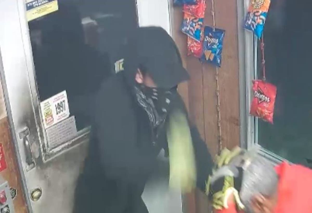 The suspect was described as a white male, approximately 5’10 tall, medium build, wearing a dark, hooded sweatshirt, green gloves and a dark bandanna covering his face.