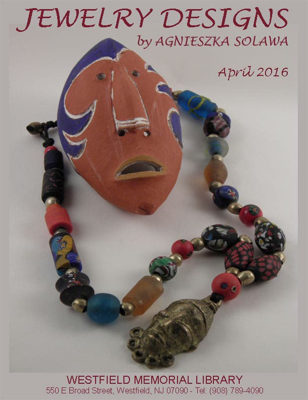 Jewelry Designs by Agnieszka Solawa. Agnieszka Solawa, an accomplished artist and an architect, is exhibiting a collection of one of a kind pieces utilizing beads and pendants dating back from the 18th century to modern times. Her jewelry is made from a variety of materials: African metal beads, trade beads, millefiori, semi precious stones and coral beads, fresh water pearls and lampwork beads, to name a few. Agnieszka captures the essence of the old tribal mysticism and incorporates it into her modern vision of the spiritual world. The necklaces are Ms. Solawa’s creation from a collection of ancient and modern beads that she acquired during her travels around the world and they will be on display through the month of April 2016 at The Westfield Memorial Library 550 East Broad Street Westfield, NJ 07901 Tel.: (908) 789-4090. To see more of Ms. Solawa’s art you can visit her site at www.solawa.com.