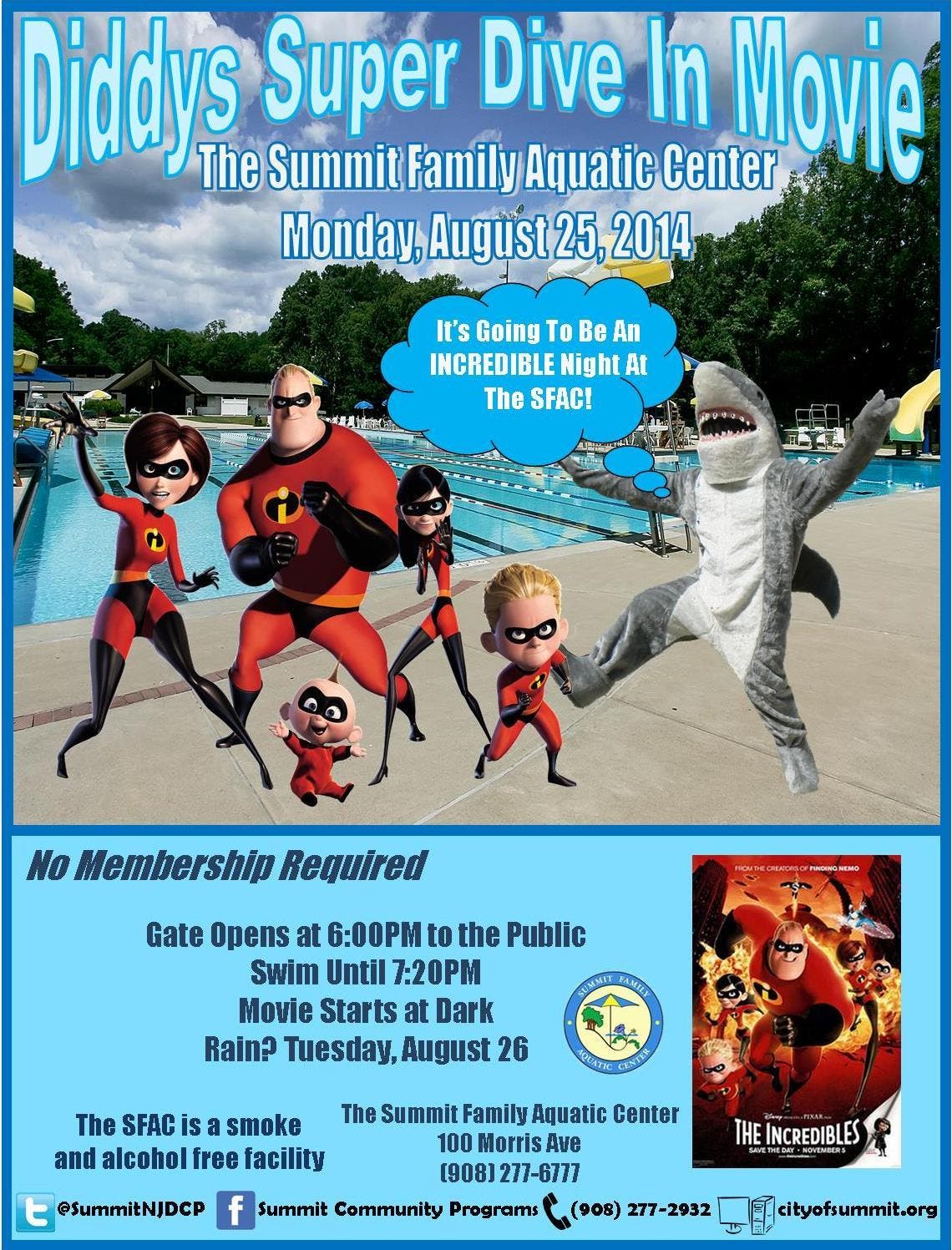 The “Summer of Superheroes” continues at the Summit Family Aquatic Center (SFAC), located at 100 Ashwood Avenue, next Monday, August 25th with a special screening of the action-packed film, The Incredibles, as part of Shark Diddy’s Annual Dive-In Movie Night.