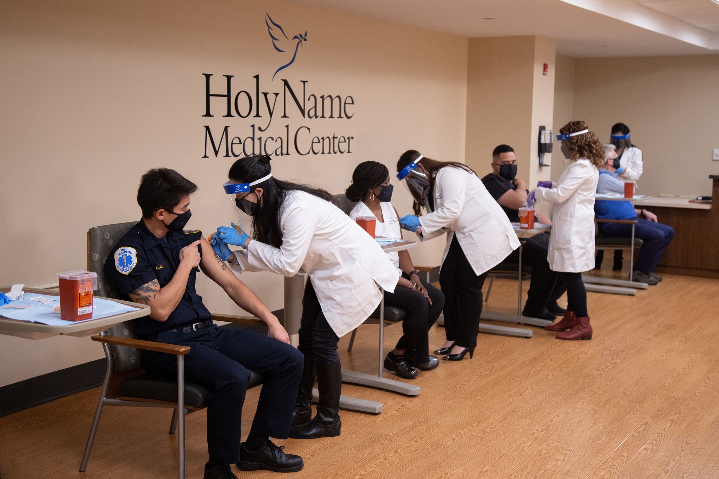 Ten employees were the first to receive the coronavirus vaccine at Holy Name Medical Center, once the epicenter of the pandemic.