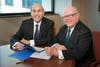 (left) Barry H. Ostrowsky, President and Chief Executive Officer for RWJBarnabas Health, sits with Stephen K. Jones, Chief Academic Officer for RWJBarnabas Health, after announcing the launch of the new partnership.