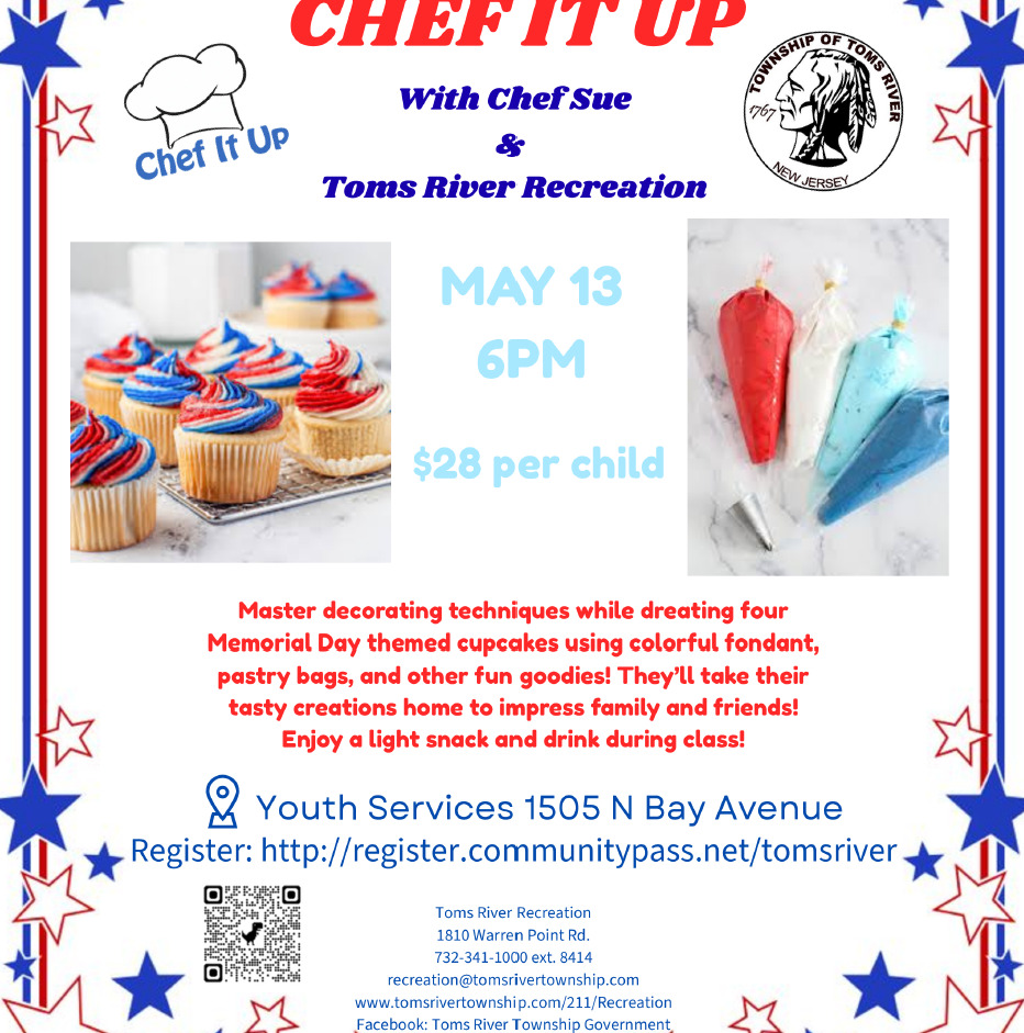 Master decorating techniques with Chef Sue while creating four Memorial Day themed cupcakes using colorful fondant, pastry bags, and other fun goodies! They’ll take their tasty creations home to impress family and friends! Enjoy a light snack and drink during class!