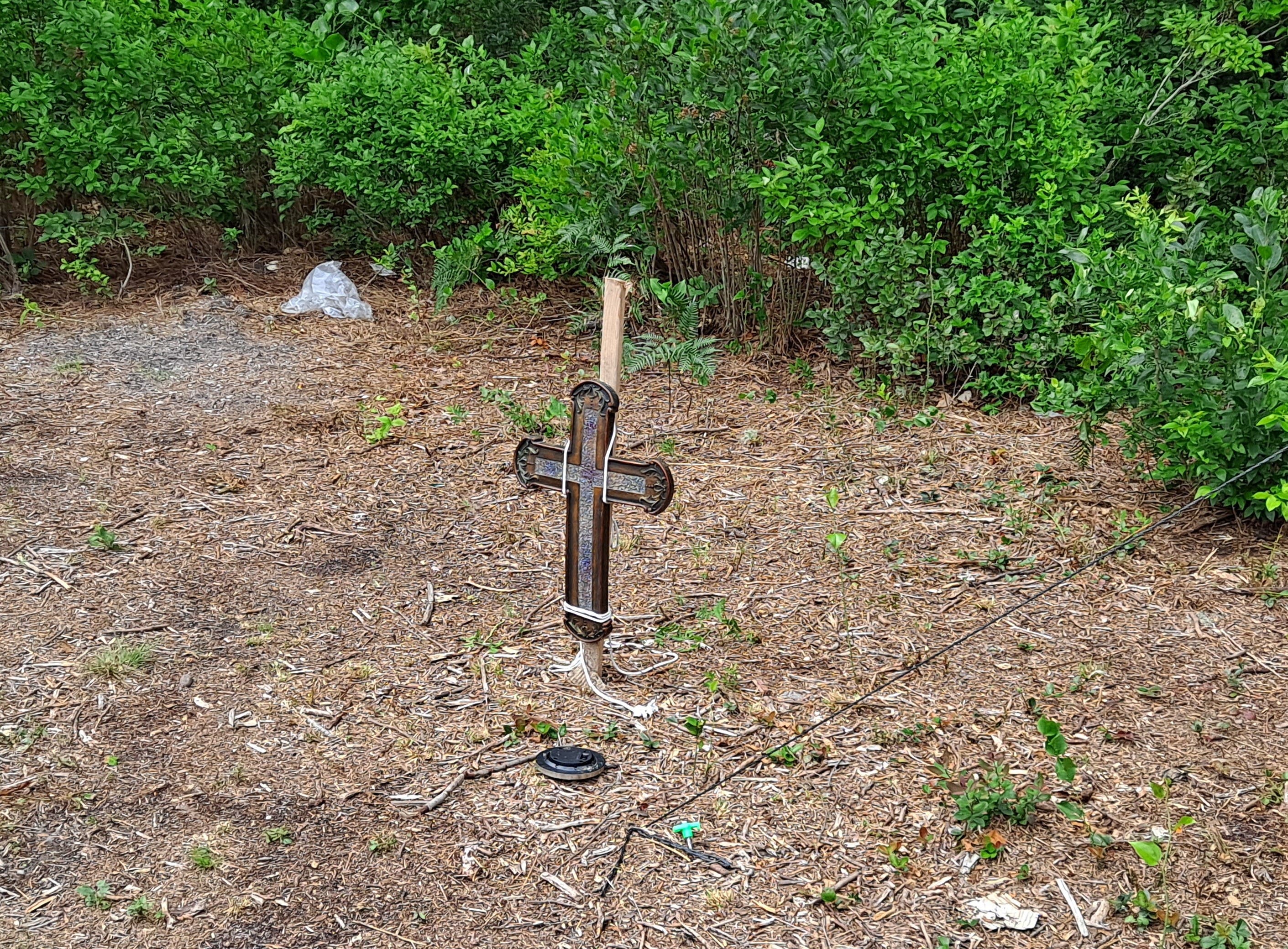 Tucked back by one tent, a small cross is stuck in the ground. It's unclear what the cross honors, though a resident of the camp died recently. The woman suffered a heart attack; Brigham said she was not at the camp when it happened, but had called one of the other residents to say she was not feeling well and was going to the hospital.