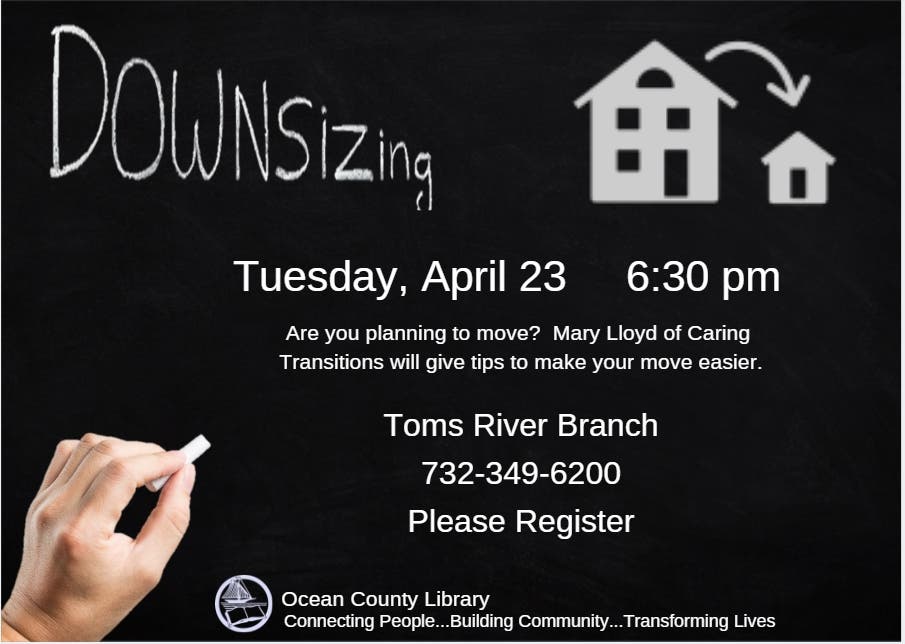 Mary Lloyd of Caring Transitions will be at the Toms River Branch of the Ocean County Library on Tuesday, April 23 beginning at 6:30 pm to give you tips for a smoother move.