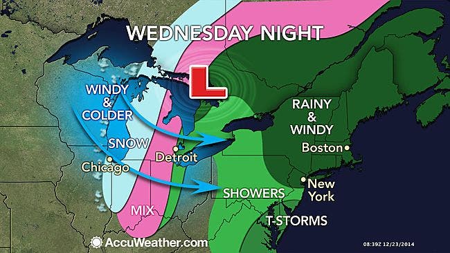 Steven DiMartino of the NY NJ PA Weather blog is calling for winds between 10 and 20 mph, but soaking rains all day Wednesday, and temperatures will be well above normal throughout the Pennsylvania and New Jersey areas. But by Christmas afternoon the skies should clear, with just a few lingering showers.