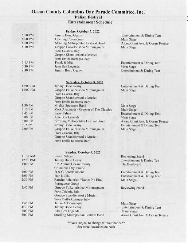 SEASIDE HEIGHTS, NJ — Get ready to eat: The Ocean County Columbus Day Parade and Italian Festival will be back in full swing this weekend in Seaside Heights.