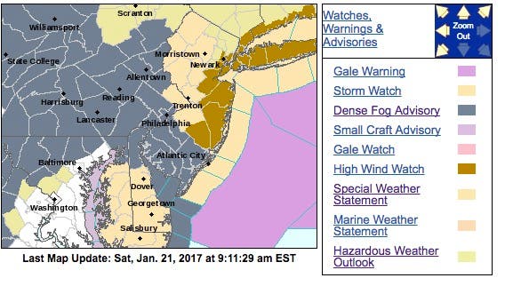 - Hazards: Strong Winds – High wind watch for east to northeasterly winds 30-40 mph with gusts to 60 mph near the NJ coast from late Sunday night through Monday afternoon. Winds 20-30 mph with gusts 40-50 mph possible farther inland along the I-95 corridor and in Delaware.