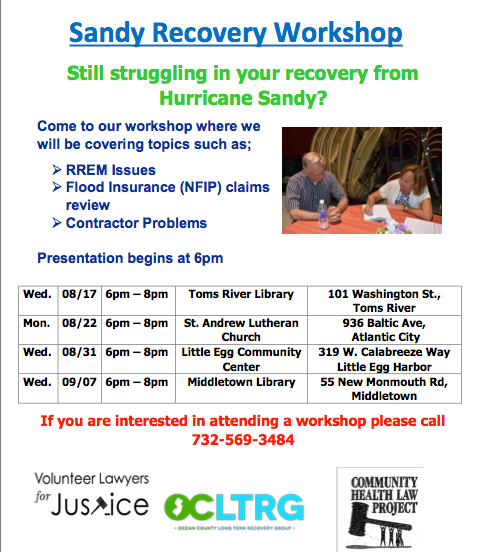 The free Sandy Recovery Workshop is scheduled for 6 p.m. to 8 p.m. on Wednesday, Aug. 17 at the Ocean County Library in Toms River.