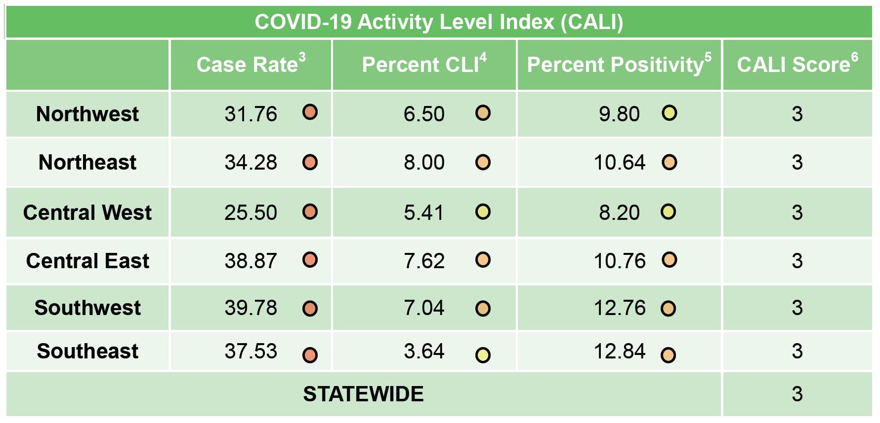 - The percent of COVID-19-like illnesses rose above 5.52 in each of the counties.