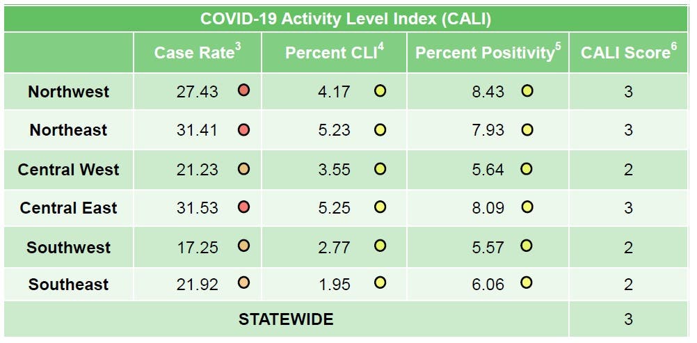 Ocean County is in New Jersey's Central East region. Its case rate rose for the week ending Feb. 27, going from 28.54 to 31.53 per 100,000 people. The case rate falls into the "very high" zone. But other metrics continue to decrease for the region. The percentage of COVID-like illnesses flickered up slightly to 5.25 this week from 5.20 last week. But the percent positivity fell again, from 8.23 last week to 8.09 this week.