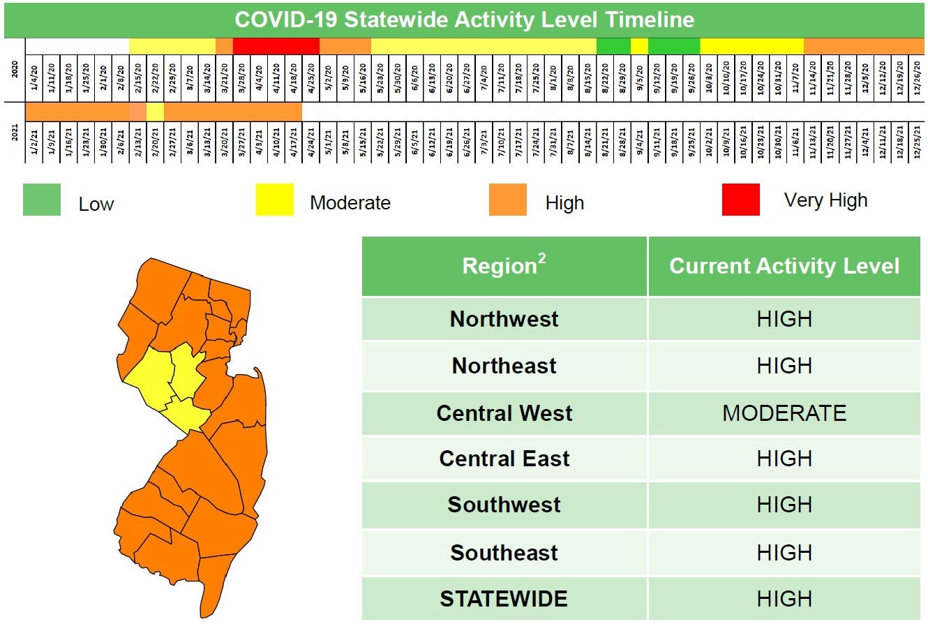 The New Jersey Department of Health's most recent COVID-19 Activity Level Report, issued Thursday for the week ending April 17, shows most of the state remains in the orange "high risk" zone, with a rate of 10 to 25 cases per 100,000 people.