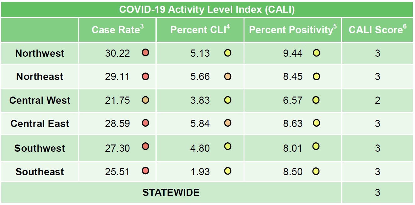The other metrics reported in the COVID-19 Activity Level Index have decreased as well for Central East. The percentage of COVID-like illnesses is at 5.84, down from 6.30 reported last week and from 7.48 for the week ending April 10. The percent positivity is at 8.63, down from 9.14 last week and from 10.61 reported two weeks ago.