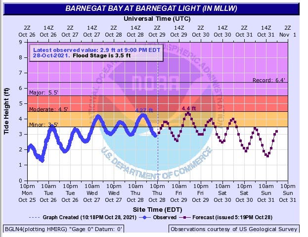 The barrier island was significantly affected, with more than a foot of water covering Route 35 north and southbound. Low-lying areas along Barnegat Bay and along the Toms River were inundated as well.