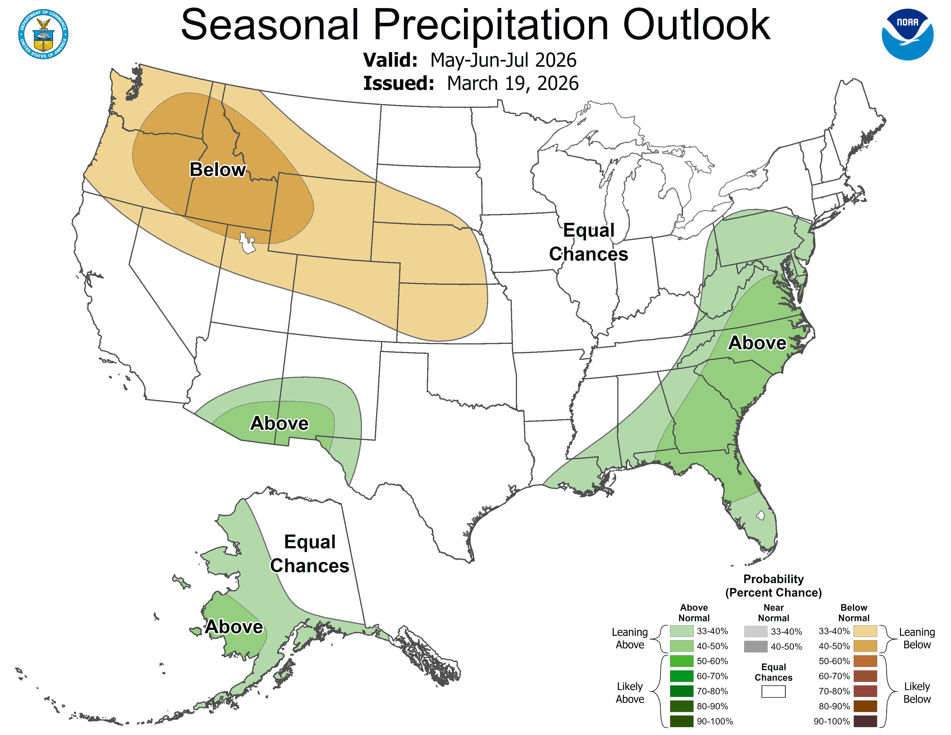 The NOAA also released precipitation probabilities from May through July, leaning toward above-average totals.