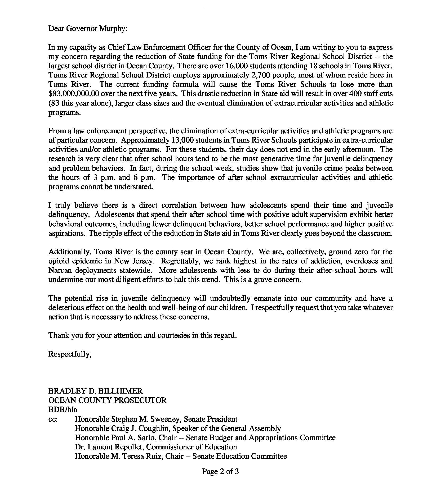 Prosecutor Bradley Billhimer has urged Gov. Murphy and state leaders to think about the larger implications of the cuts.