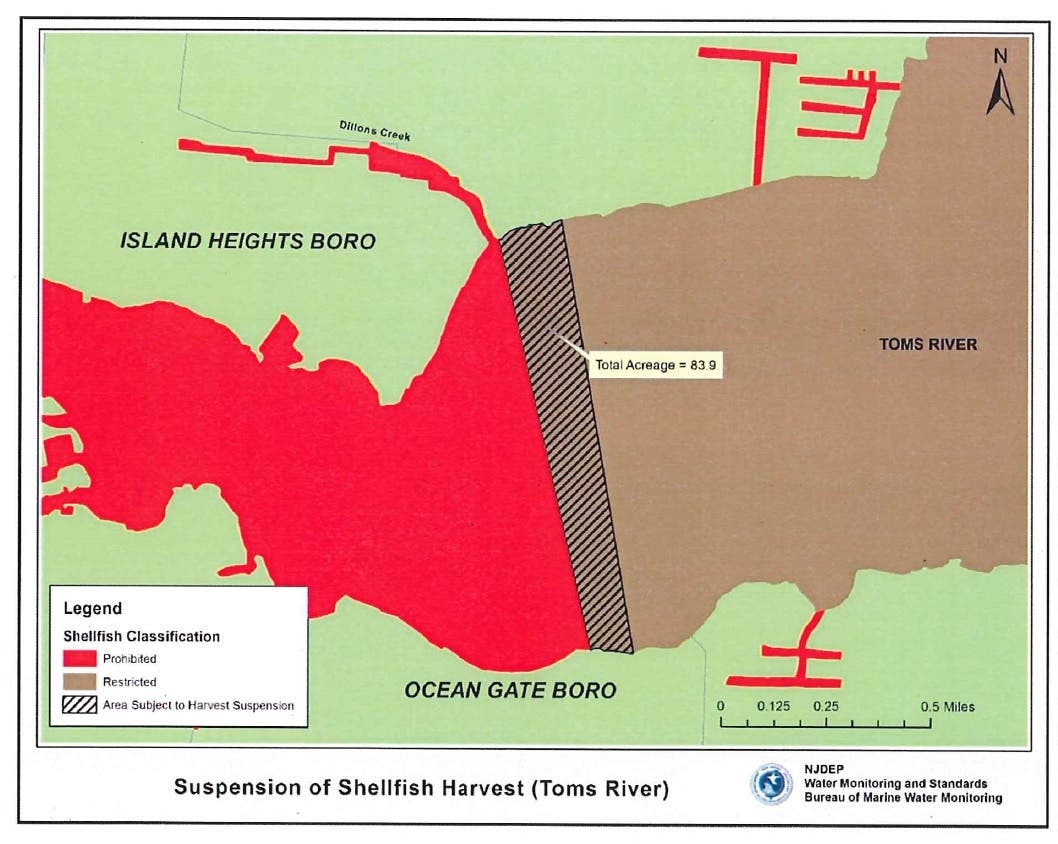 In a notice issued Wednesday, the DEP said an analysis of water sample data from the Toms River showed it has consistently exceeded the fecal coliform levels permitted for harvesting shellfish for human consumption for the last few years.