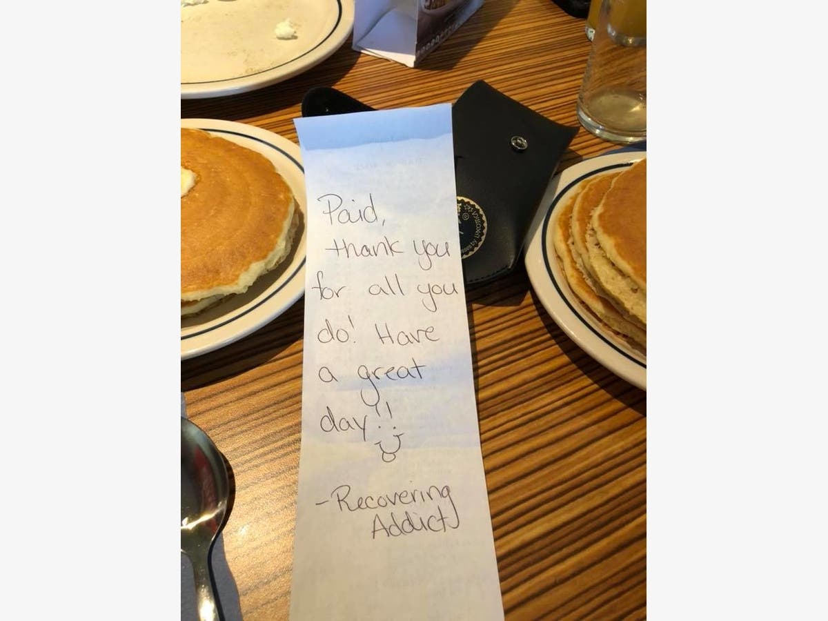 The note was simply signed "Recovering addict" with a smiley face. The woman told the restaurant's manager she wanted to remain anonymous.