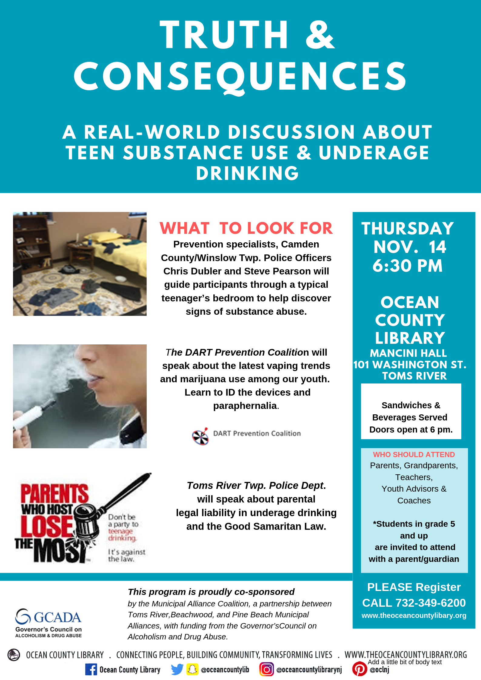 "Truth & Consequence: Real-World Discussion on Teen Substance Abuse and Under Age Drinking" at Toms River Library, November 14th @ 6:30 pm.