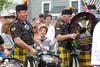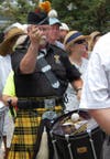 (Photo credits: Blaine Darnall, Ocean Air Support Squadron with the U.S. flag; Bob Mrozek handing the flag to a spectator, and Mrozek leading the veterans marching in. Gen Van Doren, Lindsey Rawding performing the Star-Spangled Banner; the Shamrock & Thistle Pipes and Drums marching in; Deni Rawding decked out for the holiday. All others by Karen Wall)
