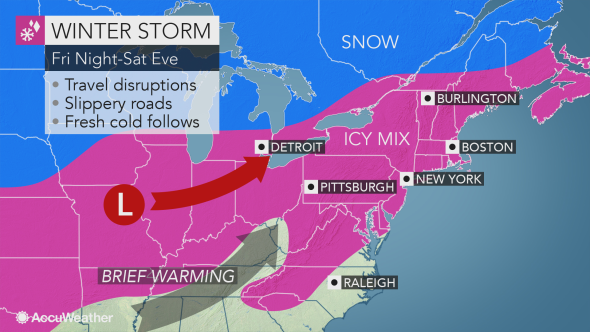 Warmer air will flow in quickly later Saturday and Saturday night in coastal and southern areas, as well as locations west of the Appalachians. However, a wedge of chilly air may remain in the central and northern Appalachians, causing an extended period of ice. These areas will be at greatest risk for trees and power lines coming down.