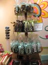 She’s not exaggerating. One entire case is filled with chocolate-covered pretzels encrusted in every kind of delectable sweet from M&M’s and Reese’s Pieces to toffee and Girl Scout mint cookies. The store has about eight kinds of peanut butter variations alone. It also has its own version of the old-fashioned black and white cookie, created in chocolate covered pretzel form.