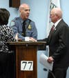 29-year department veteran takes oath at packed Township Hall ceremony.