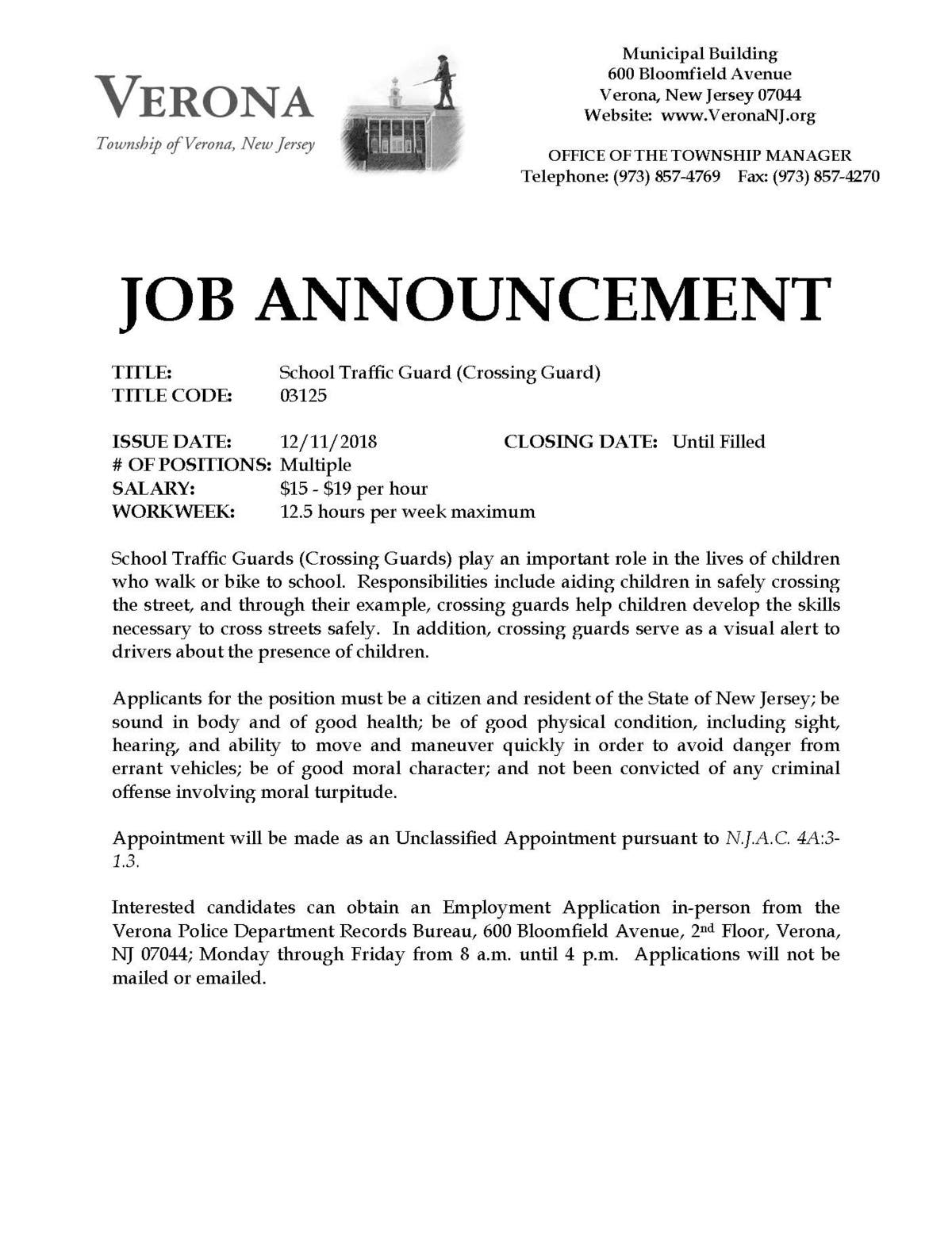 VERONA, NJ — The Verona Police Department is accepting applications for School Crossing Guard positions, officials announced Wednesday.