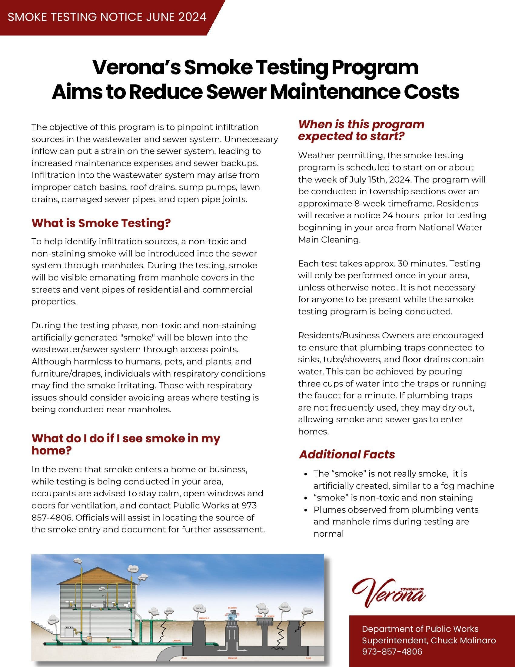 In the event that smoke enters a home or business, while testing is being conducted in your area, occupants are advised to stay calm, open windows and doors for ventilation, and contact Public Works at 973-857-4806. Officials will assist in locating the source of the smoke entry and document for further assessment.