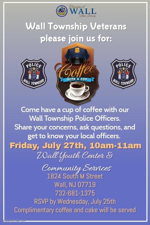 Coffee with a Cop, the community relations program, is set for Friday, July 27 at the Wall Community Center.