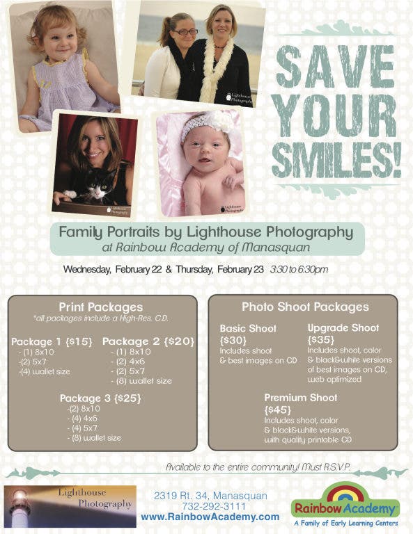 *Next Week* Lighthouse Photography will be at Rainbow Academy of Manasquan, Wednesday February 22nd and Thursday February 23rd for ultra-discounted family portrait mini sessions - please call (732) 292-3111 to RSVP
