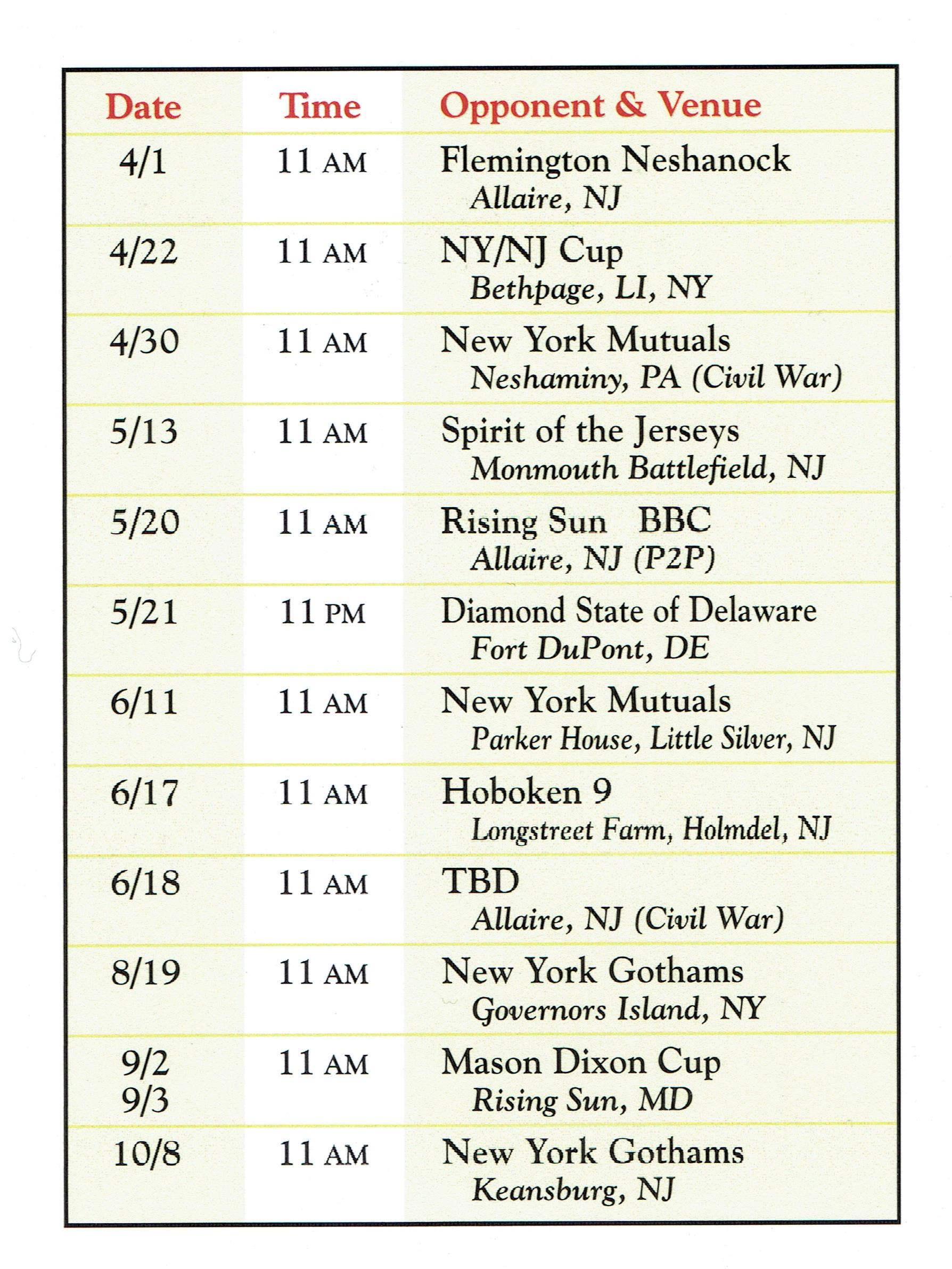 Governors Island, near Manhattan, will be the site of a game August 19th with the New York Gothams. Then Monmouth Furnace will travel to Maryland on September 2nd to compete in a tournament for the Mason-Dixon Cup. The Allaire team will finish its season in Keansburg on October 8th by facing the New York Gothams again.