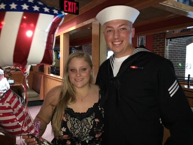 Rachel Murray of Howell and her boyfriend, U.S. Navy Hospital Corpsman Spencer Arnold of Manasquan, pose for photos after Arnold surprised her at Applebee's in Wall earlier this month. Photo provided by Applebee's