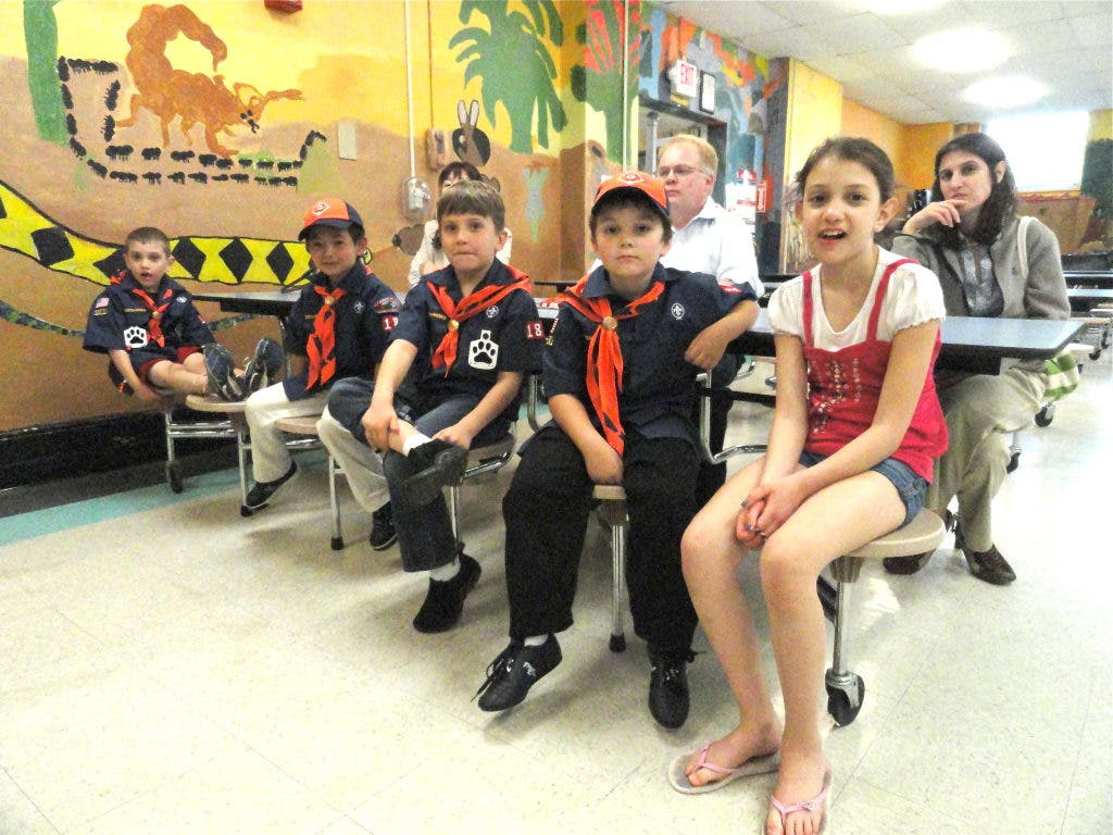 Meeting at Central School, the den members—James Young, Jack Reale, Andy Shi and Nolan Brunner, and guest Kaleigh Brunner—participated in the project as part of the Scouts' work towards a journalism activity badge.