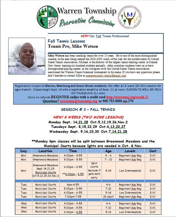 Registration is open to Warren, Watchung, and Green Brook residents. We offer an 8 week (55 min) session for ages 4-adult. Classes begin September 8th with a registration deadline of August, 28th. Rainout classes will be held on Thursdays, and there is an 8-1 ratio of student to instructor. Classes run Mondays from 4-7pm at Greenwood Meadows tennis courts, and Tuesdays and Wednesdays from 4-7pm at the Municipal Tennis Courts.