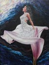 Her large paintings are now in acrylic although for her smaller work she sometimes uses water color. To achieve the smooth look to the skin on her portraits she uses layers upon layers of color washes.