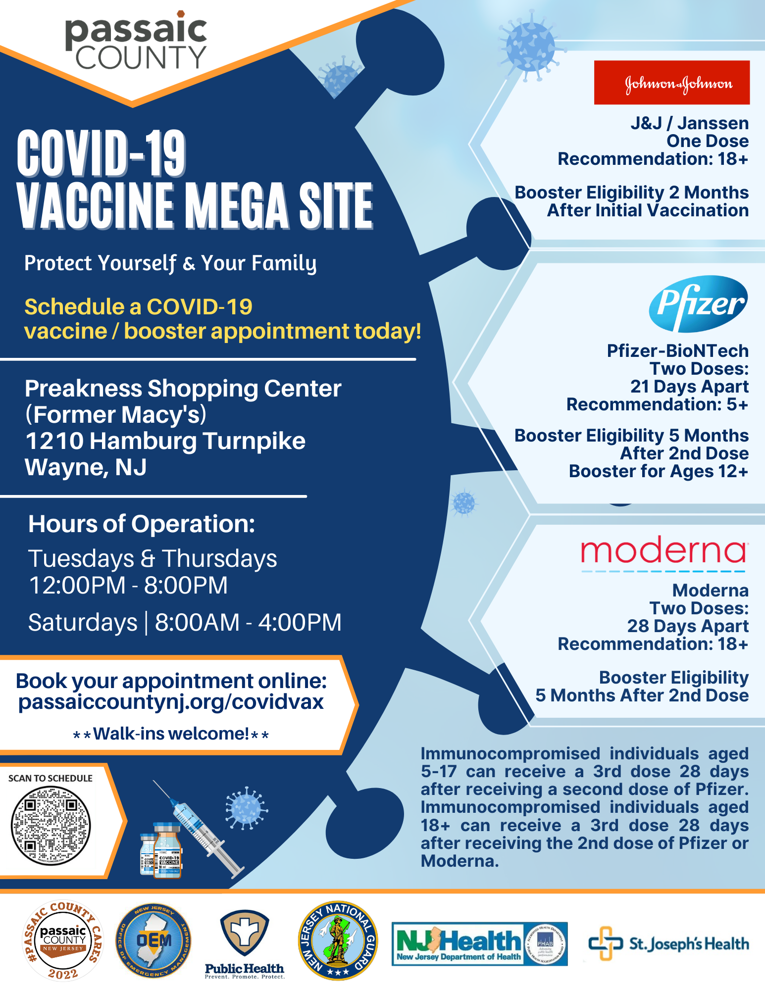 WAYNE, NJ — Passaic County will open a vaccine megasite Saturday at the former Macy's in Wayne (Preakness Shopping Center, 1210 Hamburg Tpke.).