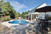 The house features a formal living room and dining room, an eat-in kitchen, family room, an office, which is used as a bar, and a master bedroom with two closets and a master bathroom.