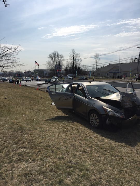 The damaged vehicle that struck the fallen pole on Route 23 Tuesday afternoon./Wayne Police Department