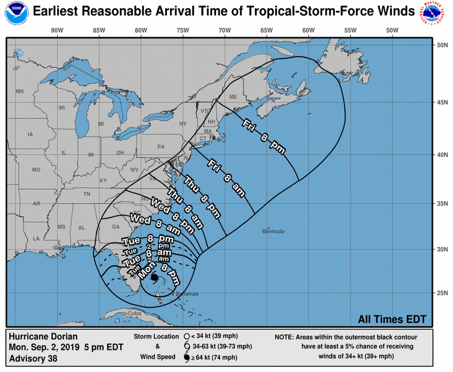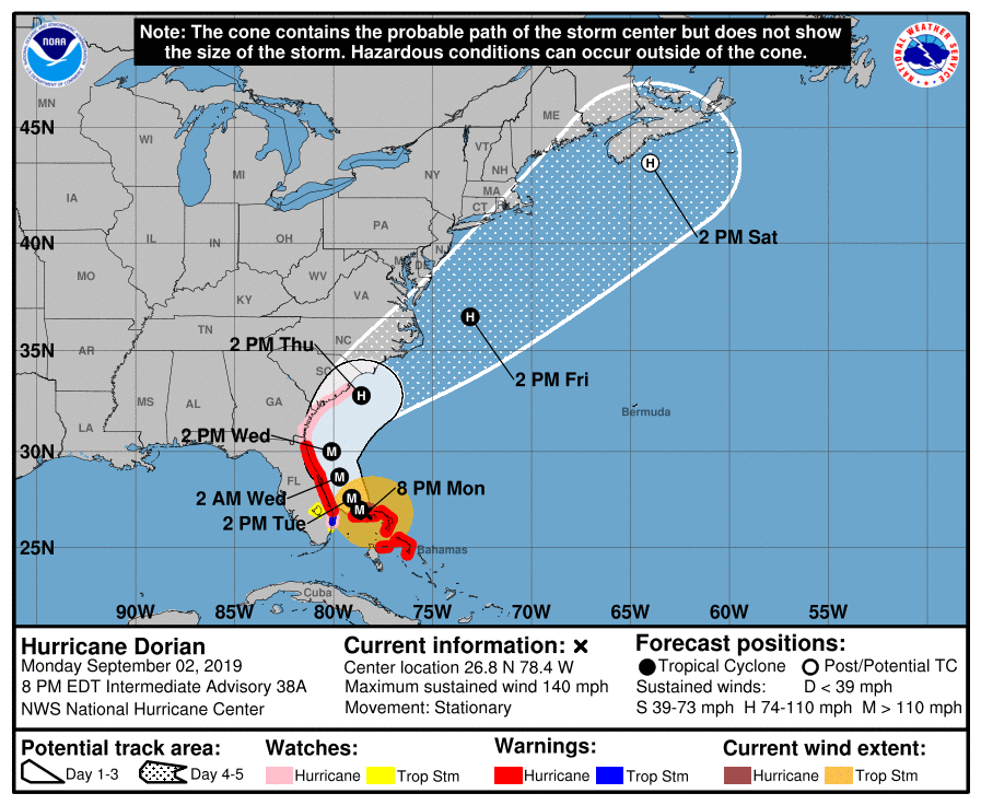 NEW JERSEY — Hurricane Dorian's tropical storm-force winds of 40 mph or more reached the Atlantic coast of Florida Monday evening, causing hurricane warnings and watches, along with storm surge alerts, to spread across the state. The slow-moving hurricane came to a virtual standstill about 105 miles off the coast.