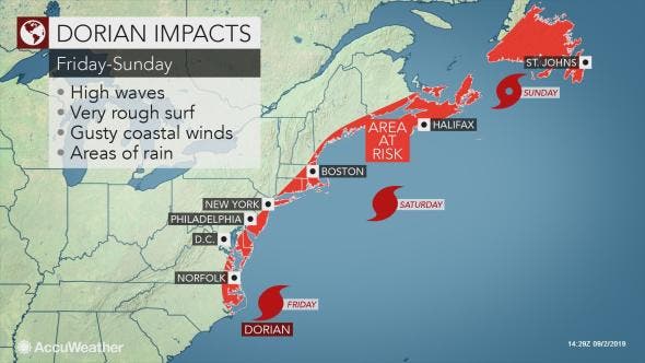 - Dorian could behave similarly to a wintertime nor'easter, even if the center stays at sea, AccuWeather says. The rain shield with Dorian may generally impact areas along and east of the I-95 corridor."