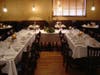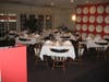 Decorators Michelle and Fadi of New York City created a red wall adorned with large, white plates opposite a gallery of enlarged vintage photos enhanced with shades of green and red. A banquet room was completely repainted and banners of red fabric are illuminated with backlighting.