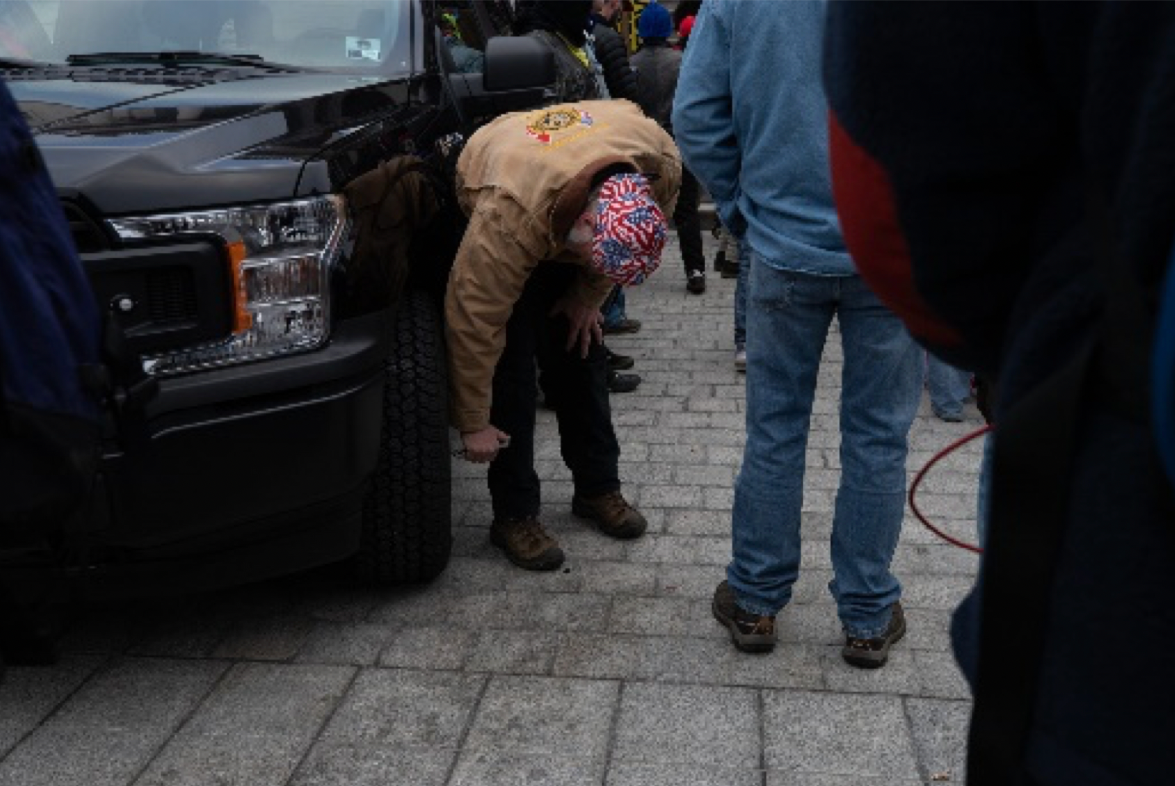 He was also seen letting the air out of tires on a black U.S. government vehicle, according to court records. A photo of Young doing this circulated on Twitter, officials said. The FBI released the photo and one showing the bandana/head covering and asked for the public's help identifying him.