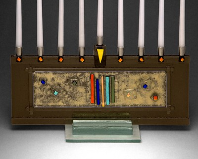 menorahs by Beame Designs. The colors are magnificent! Rounding out the gallery’s Judaica section are pottery menorahs by Renee and Howard