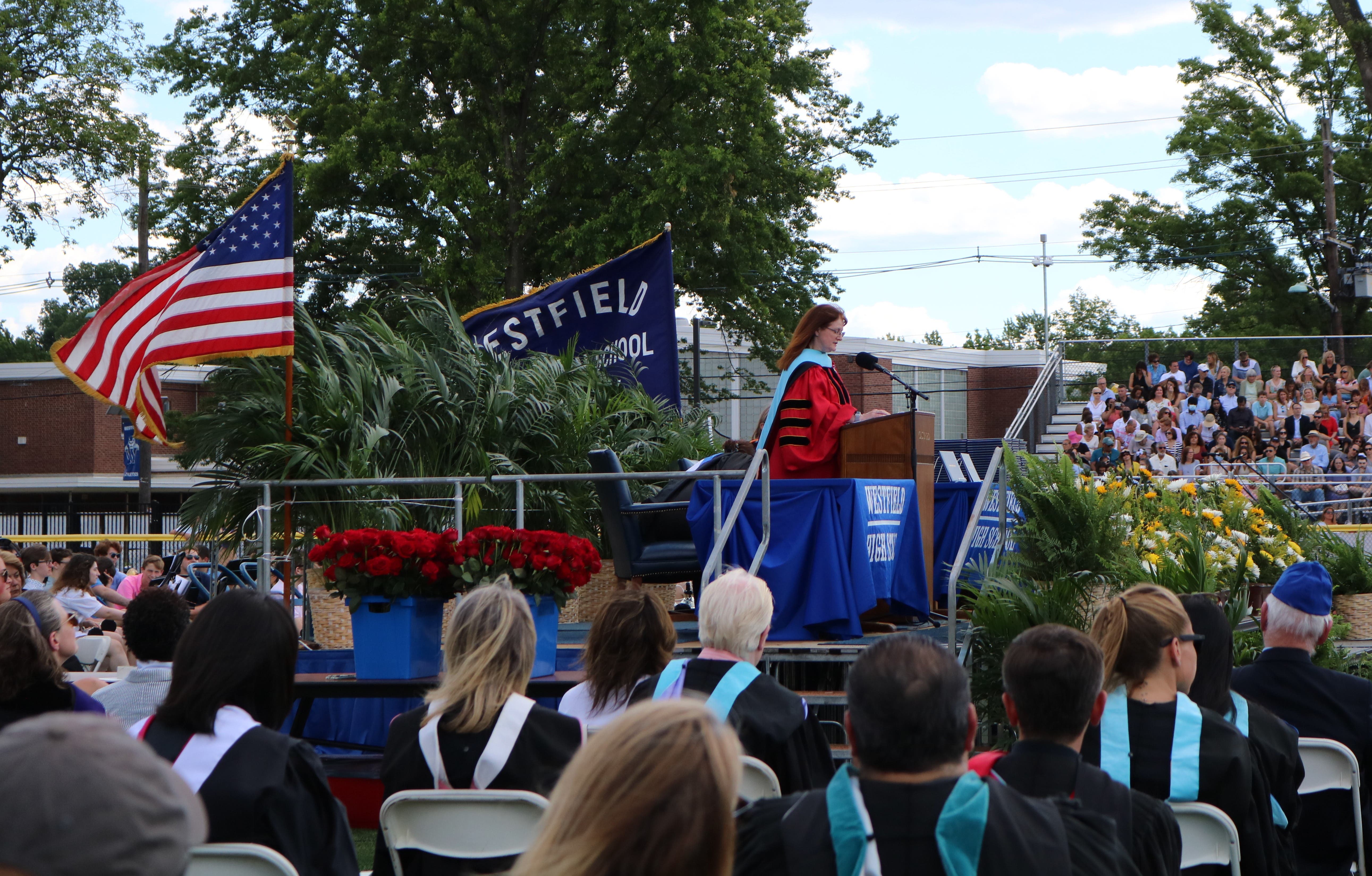 Above: Superintendent Dr. Margaret Dolan reminds the Westfield High School Class of 2021 of lessons they have learned together, as she prepares to retire on July 1.