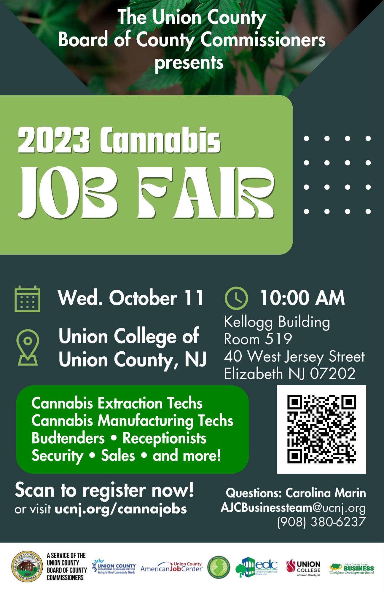 The Cannabis Job Fair will begin at 10 a.m. in the Union College of Union County Kellogg Building, Room 519, located at 40 West Grand Street in Elizabeth.