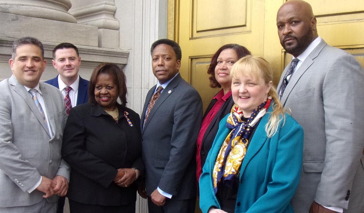 Democrats United for Progress candidates, Carlos Rivas, Alex Lospinoso, and Wilma Campbell, with Linden Mayor Derek Armstead, and Column C contenders Sylvia Turnage, Lisa McCormick, and Mark Lightner