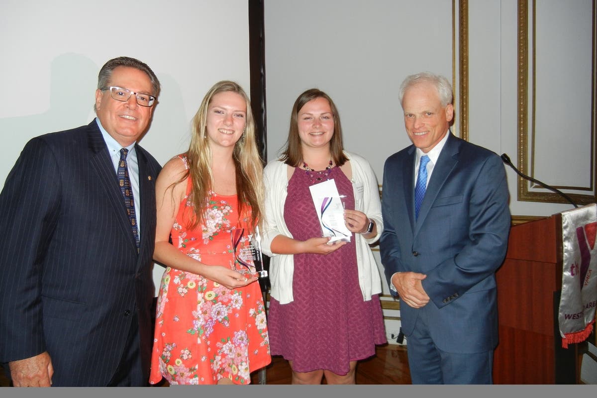 Pictured here (L-R): Westfield Area YMCA CEO Mark Elsasser, award recipients Alexis Devre and Olivia London, and Westfield Area YMCA Board Chair, John Cronin